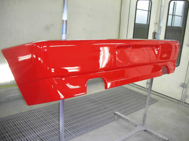 塗装は専用ブースにて施工します。 アメリカのPGGがフェラーリの指定塗料で有名ですが、今回はデュポン製のハイパーキュアという技術のトップコートを使用。 パターン幅の広いスプレーガンで、肉持ちよく肌を作っていきます。乾燥時間が非常に短いのですが、高い光沢性と保護能力がある優れたクリヤーコートです。