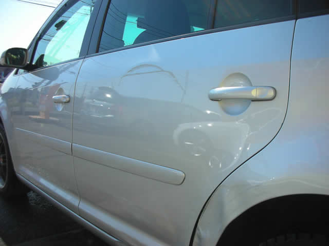 損傷状況は、リヤドアに上から下までのへこみがあり、リヤクォーターパネル、ロッカーアウタパネルには強い力が加わったようで、硬いパネルなのですがえぐったように深くへこんでいます。
