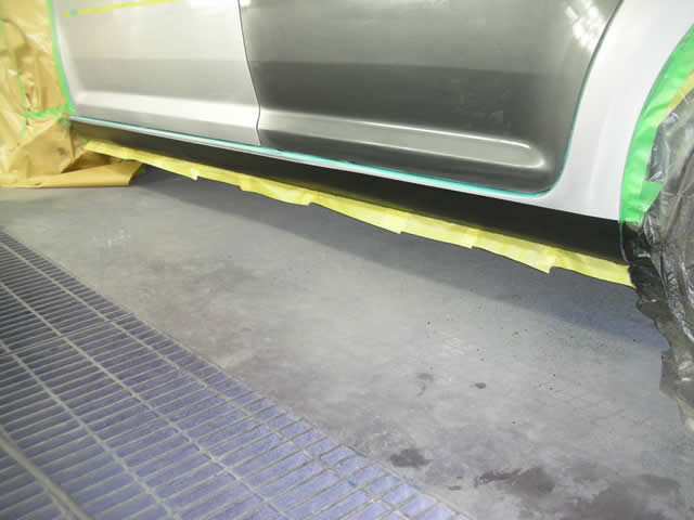 ベースコートの施工。 塗料は欧州のVOC排出規制に対応した「STANDOX」を使用。 ちなみに、非常に臭気の少ないものです。